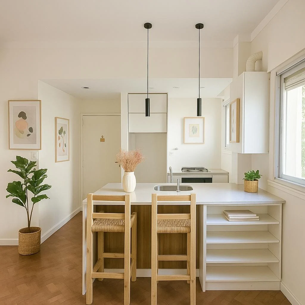 - Living con cocina integrada y una gran isla central, ideal para usar como mesa de comedor, barra o superficie de trabajo.